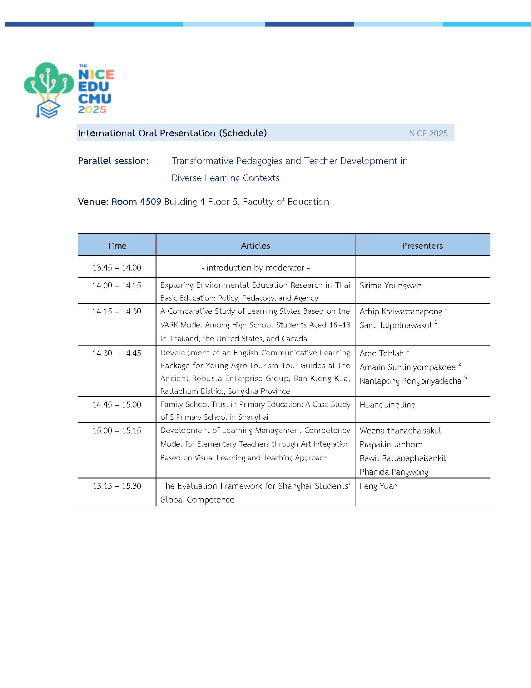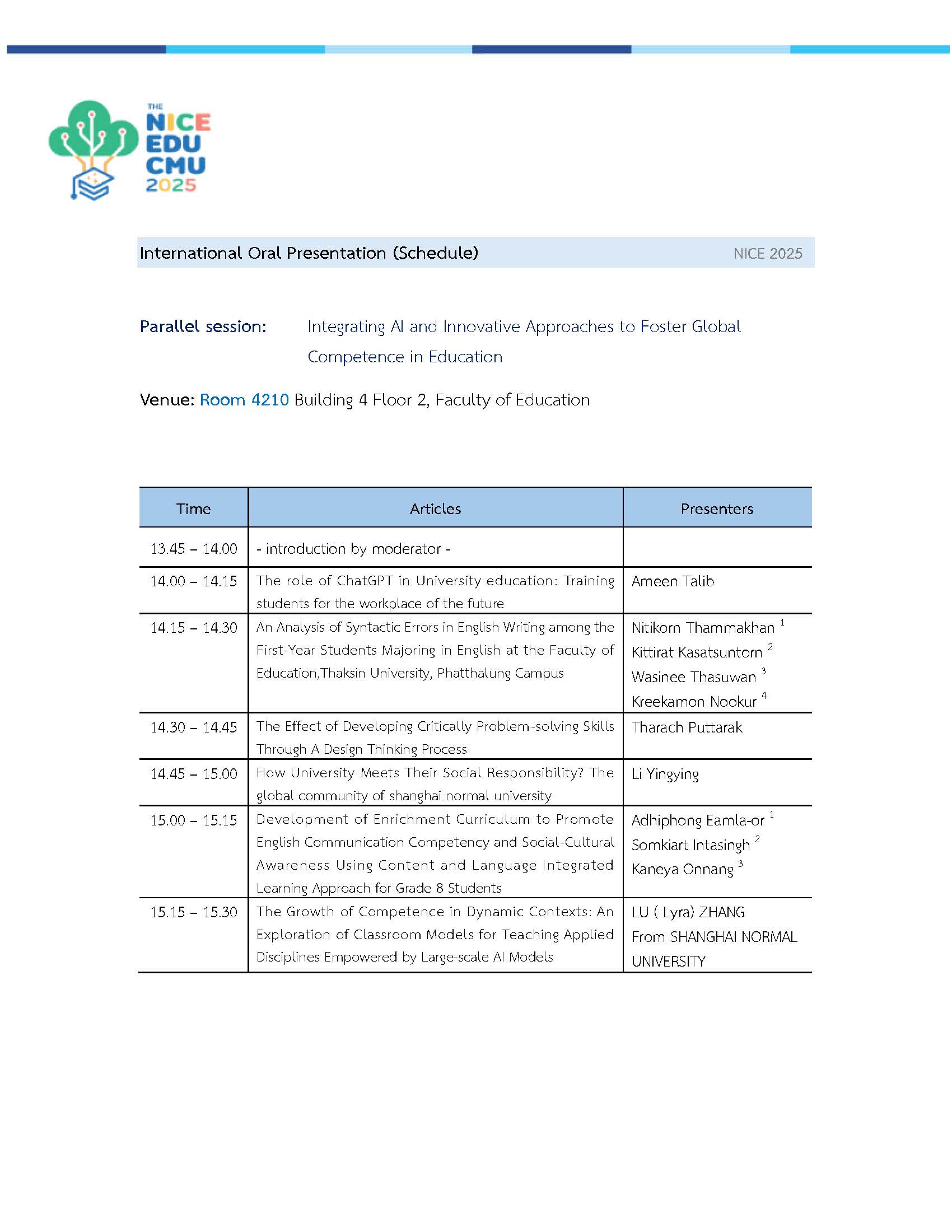 รายชื่อและลำดับผู้นำเสนอผลงาน ระดับนานาชาติ